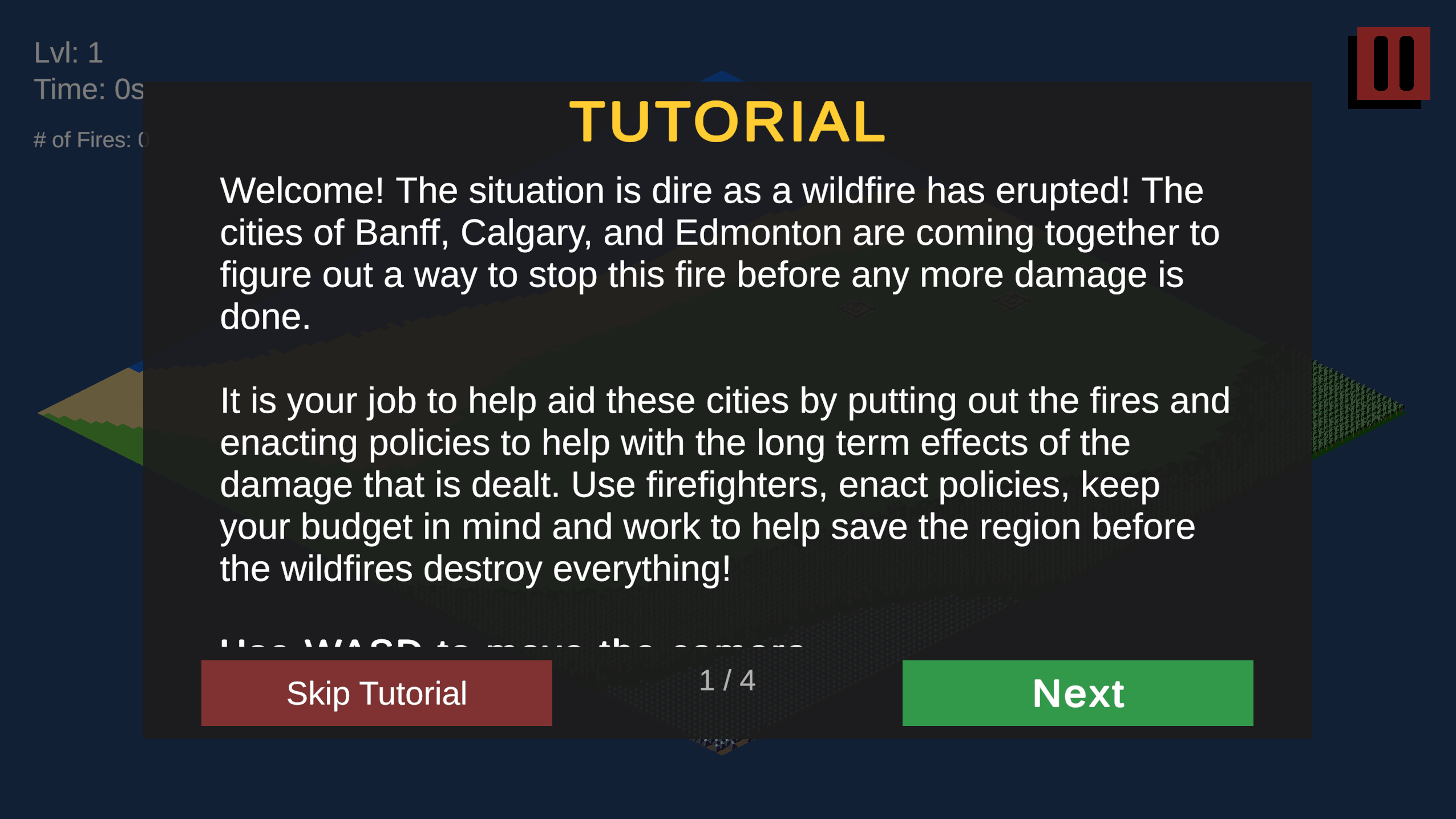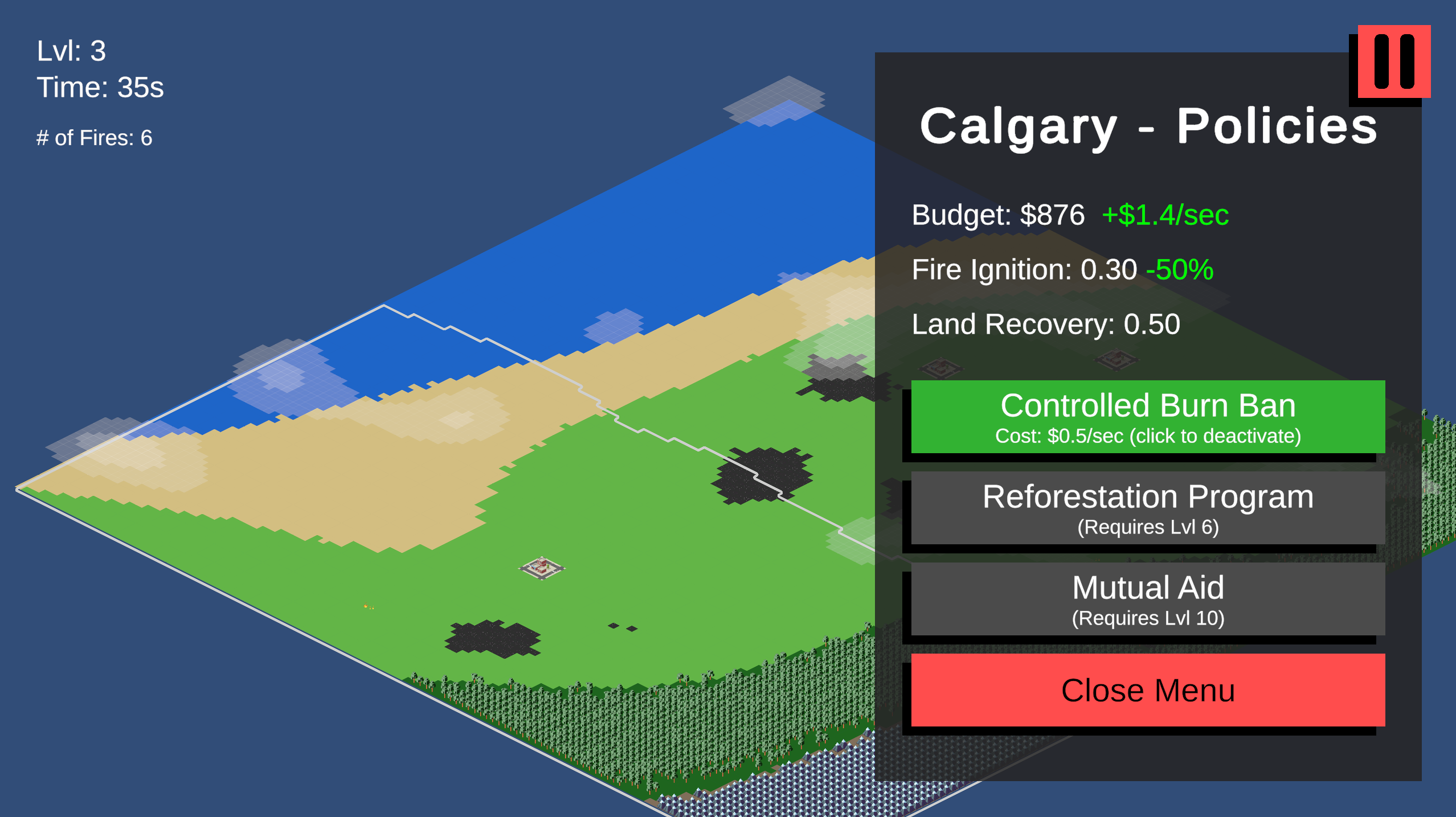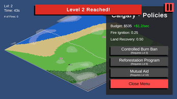 A strategy game where you take on the role of a municipal manager protecting cities from dynamically spreading wildfires. Deploy firefighters, enact policies, manage budgets, and make high-stakes decisions under time pressure as fires grow more dangerous with each level. Balance resource allocation across multiple regions, unlock new policies as you progress, and fight to keep your cities from being consumed by flames. How long can you hold the line?